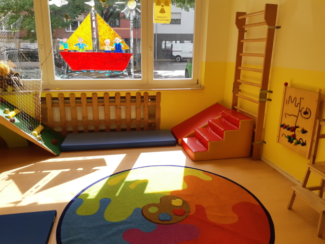 Der größte, zur Straße gelegene, Raum wird in erster Linie dem Bewegungsbedürfnis unserer Kinder gerecht. Hier befinden sich zum Beispiel eine Kletterburg, ein großes Bällebad und eine Kletterwand. Ebenfalls finden hier die Turnstunden statt.